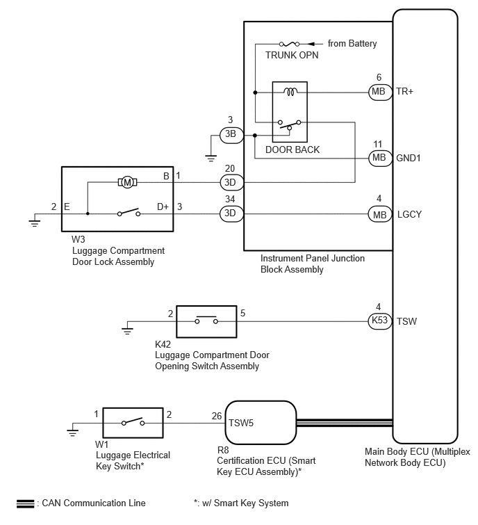 The main body ECU (multiplex network body ECU) receives switch signals from the luggage compartment door opening switch assembly and operates the luggage compartment door lock assembly to open the luggage compartment door.