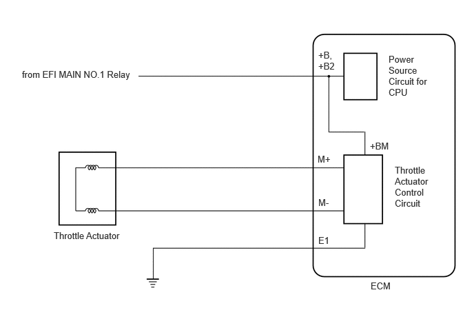 The electronic throttle control system has a dedicated power supply circuit. The voltage (+BM, +BM2) is monitored and when it is low (less than 4 V), the ECM determines that there is a malfunction in the electronic throttle control system and cuts off the current to the throttle actuator.