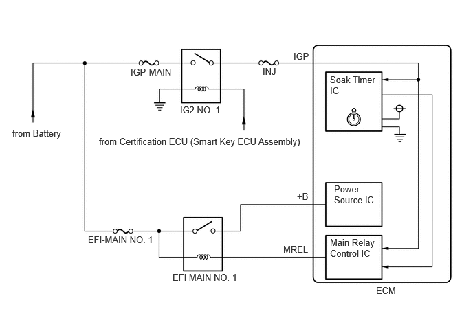 The soak timer operates after the ignition switch is turned off. When a certain amount of time has elapsed after turning the ignition switch off, the soak timer activates the ECM to perform malfunction checks which can only be performed after the engine is stopped. The soak timer is built into the ECM.