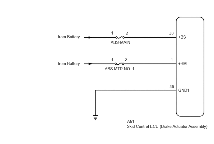 *: The skid control ECU (brake actuator assembly) monitors the resistance of the power source line at the +BS terminal. A malfunction is detected when an abnormality occurs in the +BS terminal wire harness or its connection and the skid control ECU (brake actuator assembly) determines that the wiring resistance at the +BS terminal exceeds the standard resistance.