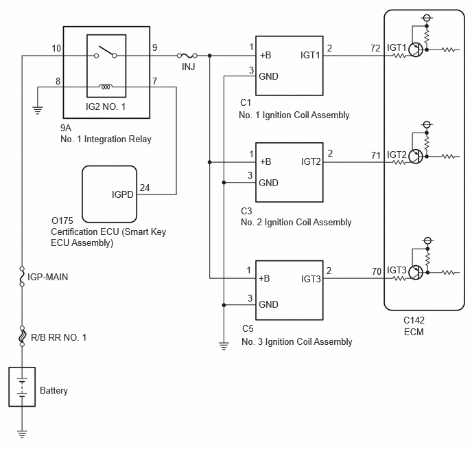 The ECM determines the ignition timing and transmits the ignition signals for each cylinder. Using the ignition signal, the ECM turns on and off the power transistor inside the igniter, which switches on and off a current to the primary coil. When the current to the primary coil is cut off, high voltage is generated in the secondary coil and this voltage is applied to the spark plugs to create sparks inside the cylinders.