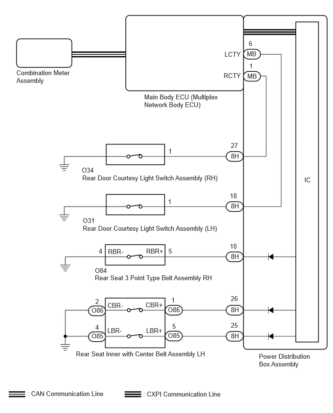 The power distribution box assembly sends a signal indicating a rear seat belt status when the ignition switch is ON to the main body ECU (multiplex network body ECU) via CXPI communication.